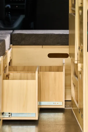 Lit peigne Tchao Tchao pour van avec matelas HR35 8 cm et trois tiroirs intégrés pour optimiser l’espace de rangement sous le couchage.