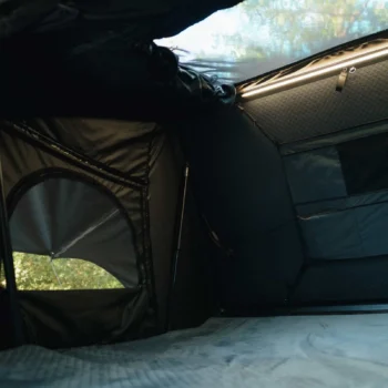 Une fois ouverte, l’espace intérieur d’environ 120 × 200 cm comprend un matelas haute densité et des grandes ouvertures à moustiquaires pour une ventilation naturelle qui réduit la condensation. De plus, un éclairage LED intérieur améliore le confort pour les soirées sous tente.