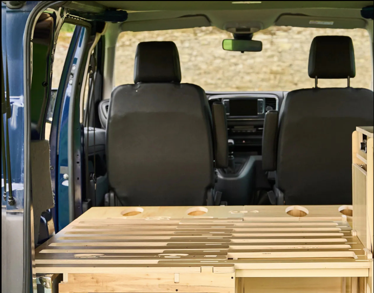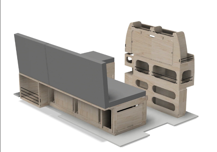 Kit d’aménagement intérieur pour van aménagé en configuration en L, avec modules de couchage, rangements intégrés et surfaces pratiques. Solution modulable pour optimiser l’espace, idéale pour vanlife, camping et voyages en itinérance.