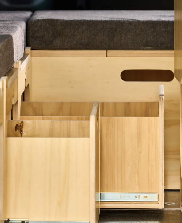 Le mobilier est fabriqué en contreplaqué robuste et léger, offrant durabilité et résistance à l’usage mobile. La structure modulaire associe des zones de couchage adaptées, des espaces de rangement astucieux et des surfaces utilisables au quotidien, tout en laissant une circulation fluide à l’intérieur du véhicule.