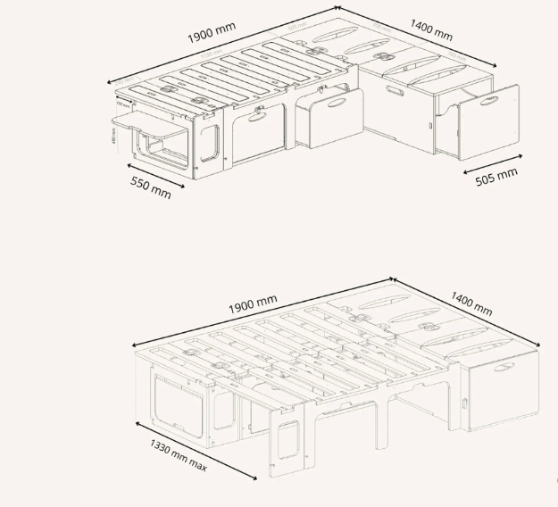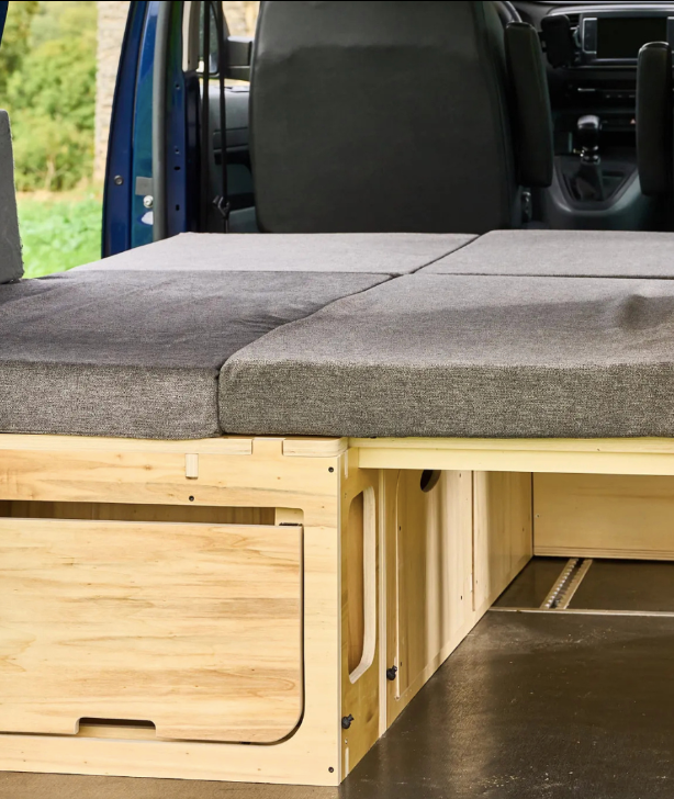 Ce lit peigne en L est une solution idéale pour les vanlifers, les amateurs de road-trip ou les voyageurs réguliers souhaitant un mobilier durable, confortable et facile à utiliser à l’intérieur de leur véhicule.