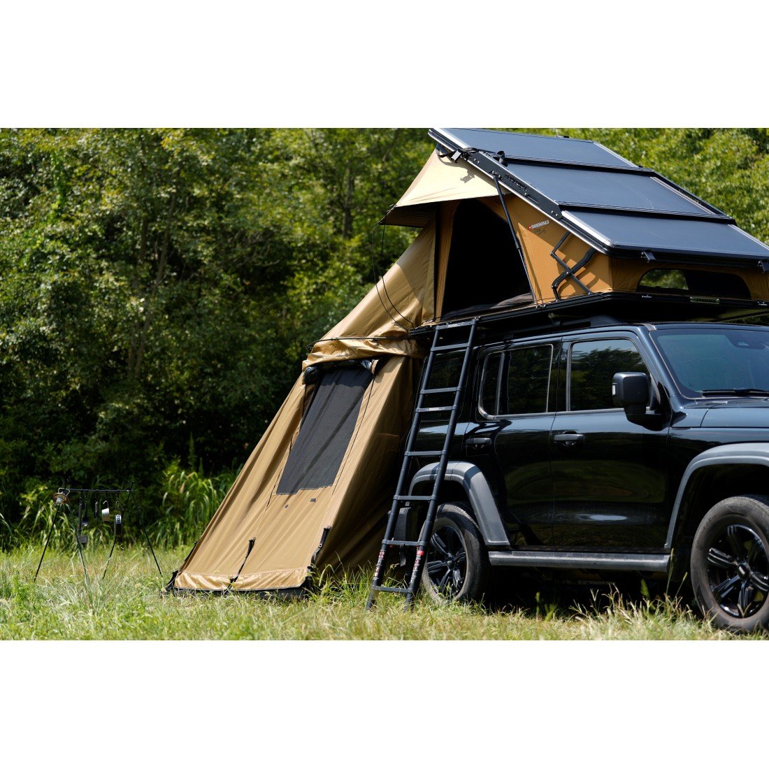La toile principale en 320 g ripstop coton est accompagnée d’un tissu de surbâche en polyester 210D Oxford (PU 3000 mm) offrant une très bonne résistance à l’eau et aux intempéries. Le matelas haute densité de 5 cm à mémoire de forme avec housse coton et sous‑matelas anti‑condensation assure un bon confort de couchage. La tente s’ouvre ou se referme en environ 10 secondes grâce à deux vérins hydrauliques, et comprend une échelle télescopique en aluminium ainsi qu’un éclairage LED intérieur.