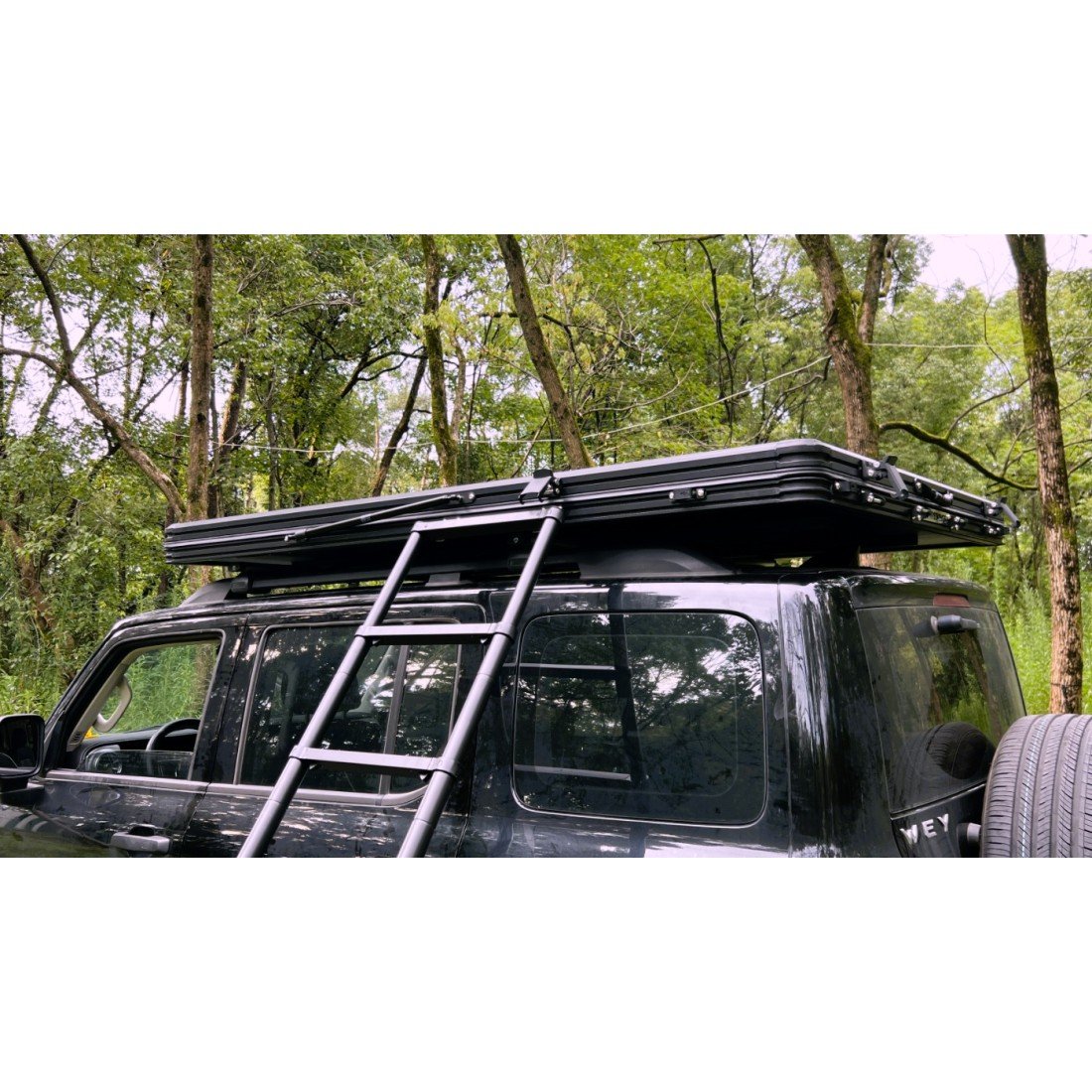 Tente de toit rigide Swisskings Taiga en aluminium avec toile ripstop 320 g, matelas mémoire de forme 5 cm, ouverture hydraulique rapide (~10 s), LED intérieure, sous‑matelas anti‑condensation et échelle télescopique.