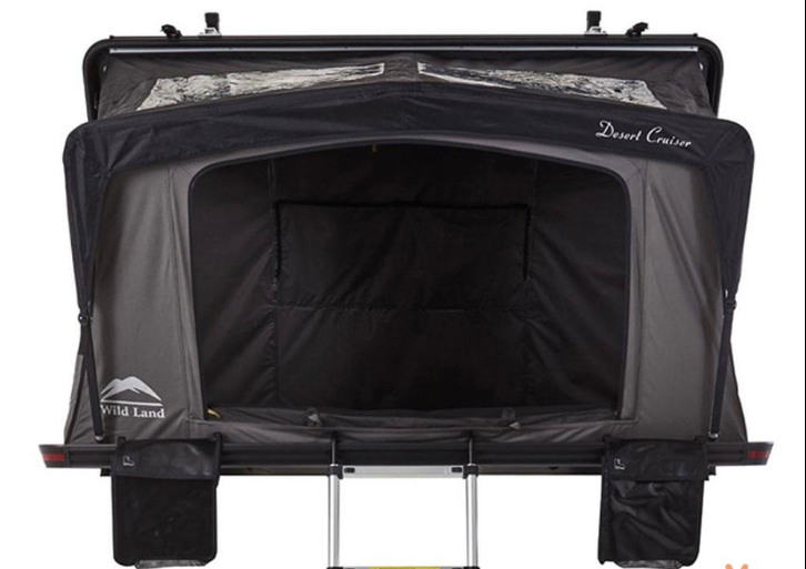 Tente de toit Wild Land Desert Cruiser Pro 120 avec grandes ouvertures ventilées, éclairage LED intérieur et matelas confort — idéale pour nuits en pleine nature.